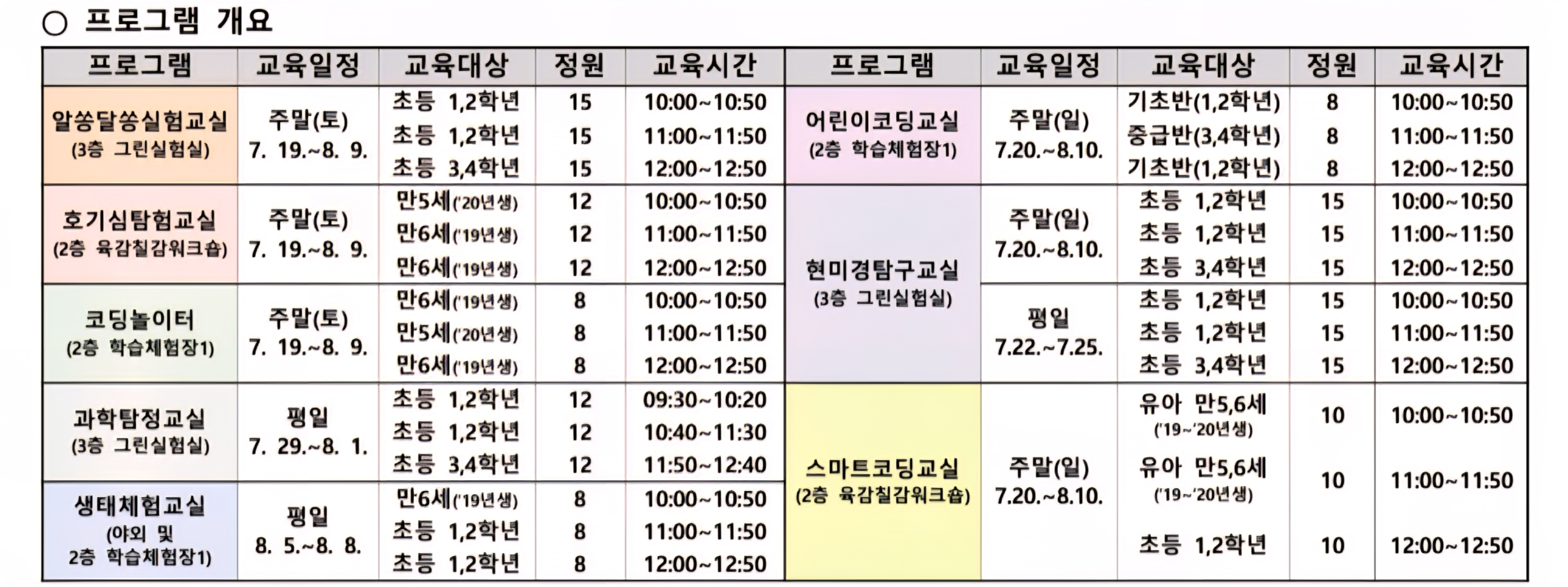 이번 프로그램은 과학 실험부터 코딩, 생태체험까지 폭넓게 구성되어 있으며, 유아부터 초등학생까지 참여할 수 있어 아이들의 흥미와 사고력을 기르는 데 큰 도움이 될 것입니다.